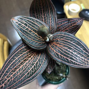結構な大株になっても、ほほ中心に一本の赤脈が入るだけの超地味系なジュエルオーキッドです。